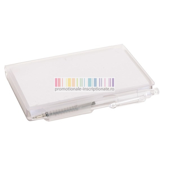 Mini notebook cu coperta semitransparenta si pix de aceeasi culoare.