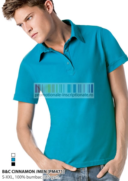 Tricouri polo promotionale barbatesti, Cinnamon, cu maneci scurte si guler polo cu 3 nasturi, confectionate din bumbac 100% single jersey, 185 gr/mp, disponibile in 3 culori si marimi de la S la XXL cu talie scurta.