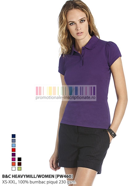Tricouri polo promotionale de dama, Heavymill Women, cu maneci scurte si guler polo cu 2 nasturi, confectionate din bumbac 100% pique, 230 gr/mp, disponibile in 11 culori si marimi de la XS la XXL, cu talie scurta.