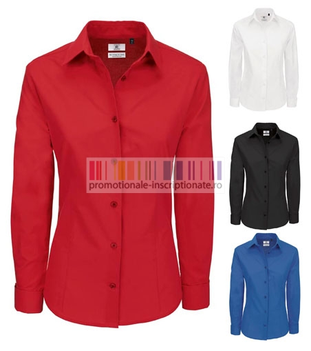 Camasi promotionale de dama, Heritage LSL Women, maneci lungi si guler feminin, confectionate din bumbac 100% poplin 120 gr/mp, disponibile in 4 culori si marimi de la XS la 4XL, cu mansete late, pliuri la spate si talie cu tiv curbat.