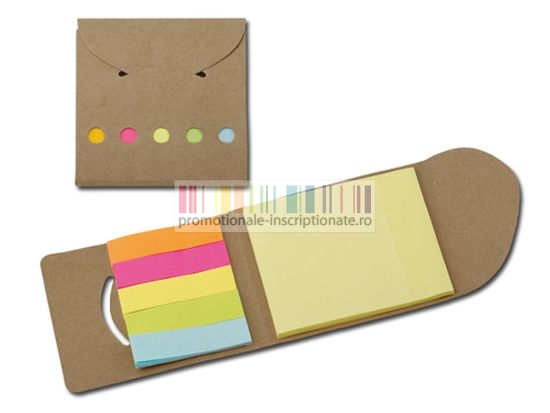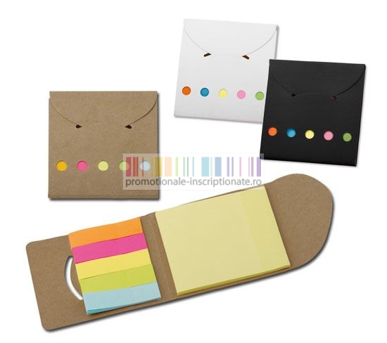Carnetele promotionale cu forma de plic, cu coperti din hartie reciclata disponibile in trei culori, cu etichete autoadezive colorate si post-it incluse.