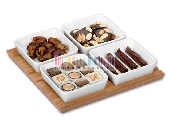 Seturi de patru farfurii promotionale din portelan cu tava din lemn de bambus - 81334