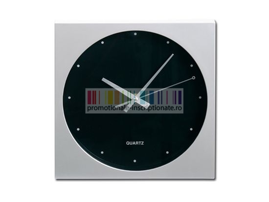 Ceasuri promotionale analogice de perete, cu carcasa argintie din plastic si forma patrata.