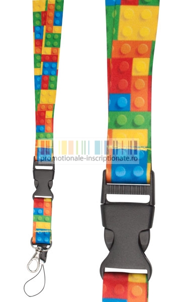 Lanyard-uri promotionale realizate din poliester sublimabil, cu carabina neagra din plastic detasabila, carabina metalica si snur negru pentru telefon.