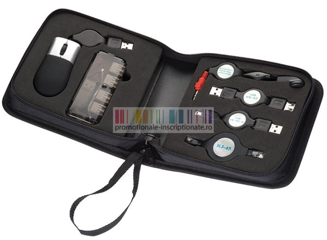 Seturi promotionale pentru PC ce includ: mouse optic cu cablu retractabil, porthub cu 4 conexiuni USB, head set, USB-prelungitor, USB miniprelungitor si un cablu modem, ambalate intr-o mapa cu fermoar.