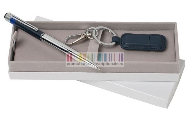 Seturi Cacharel de lux, compuse din breloc cu memory-stick de 8 Gb cu capac si finisari din piele naturala albastra, si pix metalic cu finisari albastre si accesorii cromate argintii.