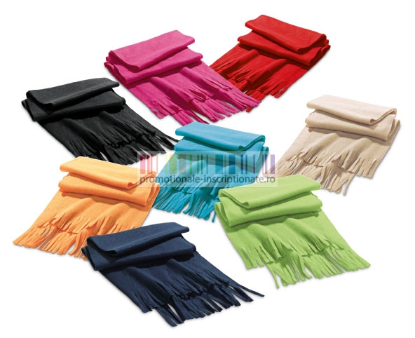 Fulare promotionale colorate, confectionate din polar fleece 200 gr / mp - disponibilie in 8 culori (rosu, roz, albastru, verde, galben, turquoise, alb si negru) cu franjuri pe margini.