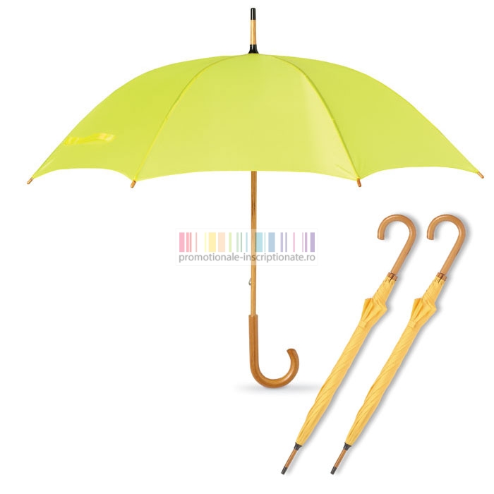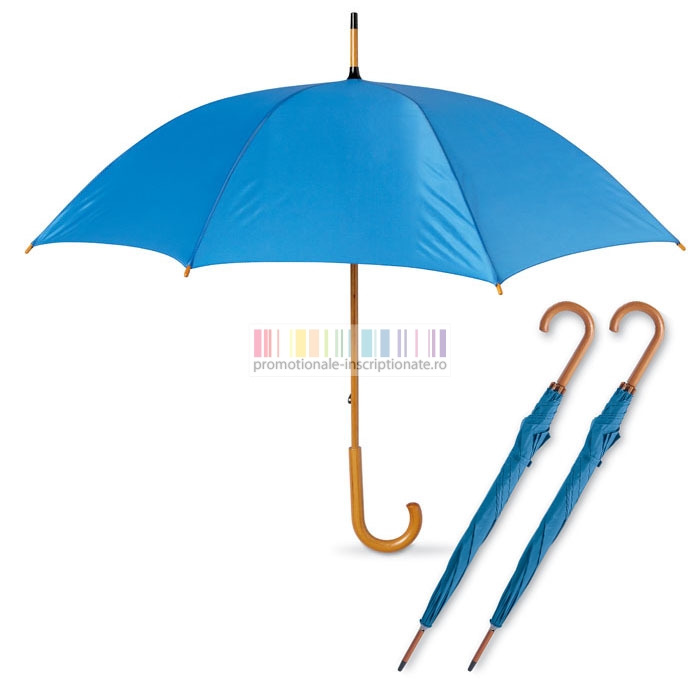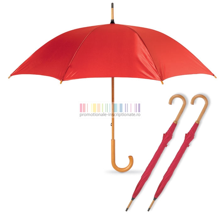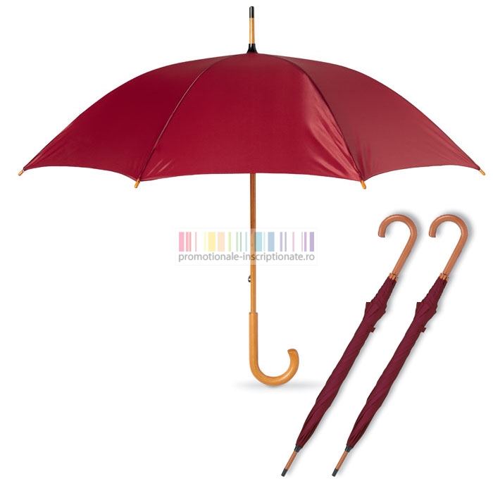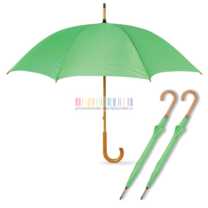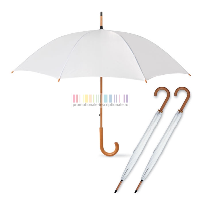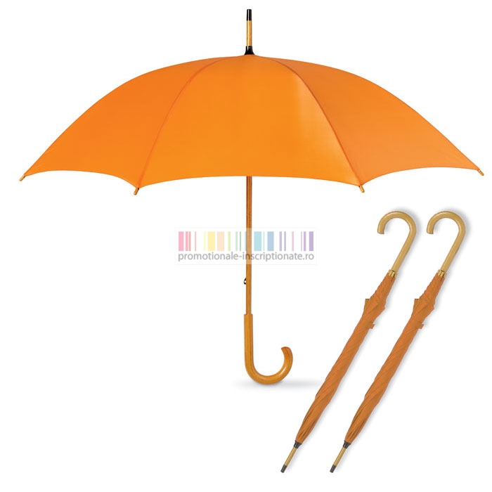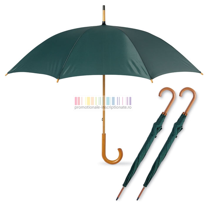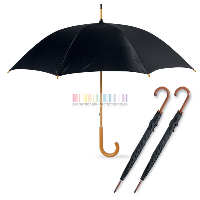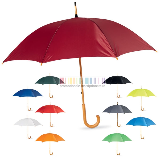 Umbrele promotionale cu 8 panele si deschidere manuala, confectionate din poliester 190T cu maner curbat din lemn si diametru de 104 cm.