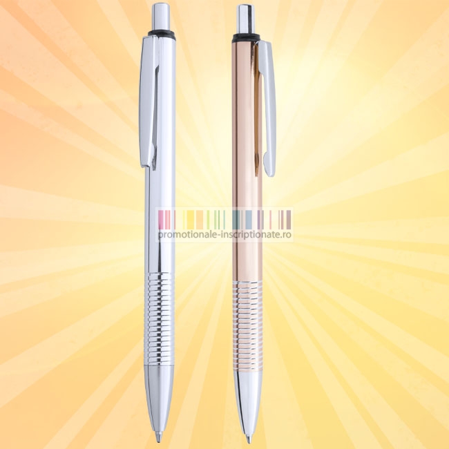 Pixuri metalice promotionale, cu corp disponibil in 2 culori (auriu si argintiu) cu finisari lucioase, mecanism de deschidere prin apasare, pasta de scris albastra si grip cu model frezat.