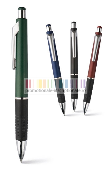 Pixuri promotionale cu corp disponibil in 4 culori, grip negru cauciucat, accesorii cromate argintii, pasta de scris albastra, agatatoare moderna si mecanism de inchidere/deschidere prin apasare.