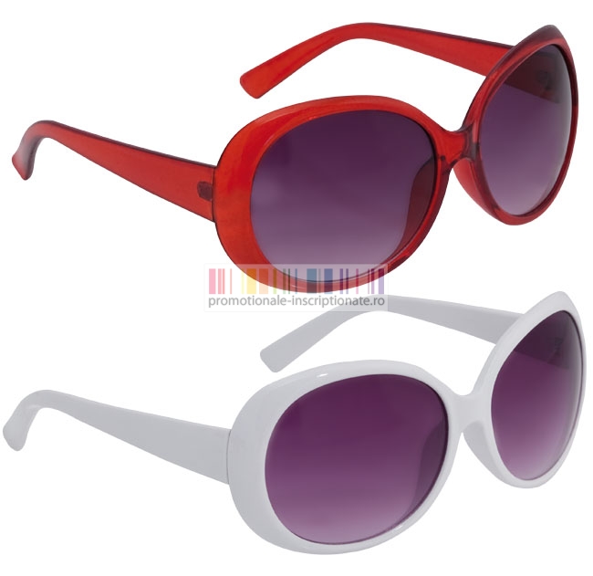 Ochelari promotionali de soare cu rame colorate supradimensionate, realizate din plastic si disponibile in 3 culori (rosu, negru si alb) cu lentile cu protectie UV - 400.
