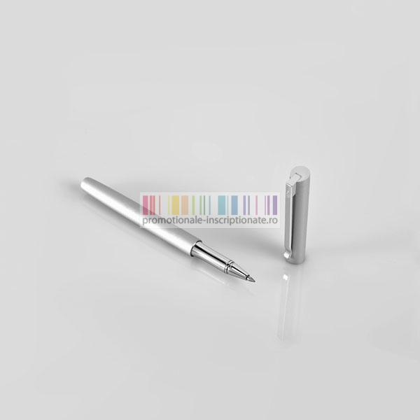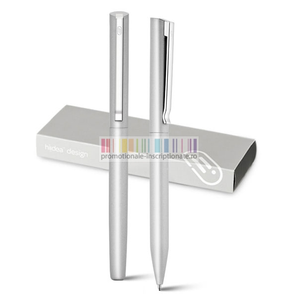 Set de doua pixuri promotionale realizate din aluminiu cu corp argintiu mat, agatatoare cromata si pasta de scris neagra.