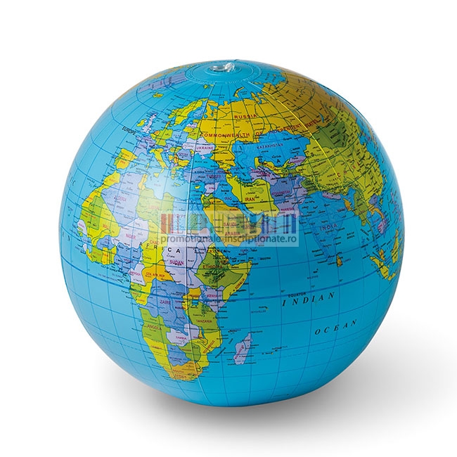 Mingii gonflabile promotionale de plaja, realizate din plastic cu diametru de 26 centimetri si imprimeu cu harta politica a globului pamantesc.