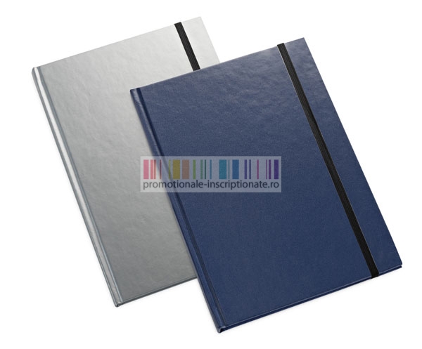 Carnetel promotional de format B5 cu coperti rigide din carton cu aspect lucios, cu elastic pentru prindere si 80 de pagini liniate.