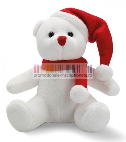 Ursulet alb promotional realizat din plus cu caciulita rosie de Mos Craciun si fular rosu cu ciucure si blanita alba.