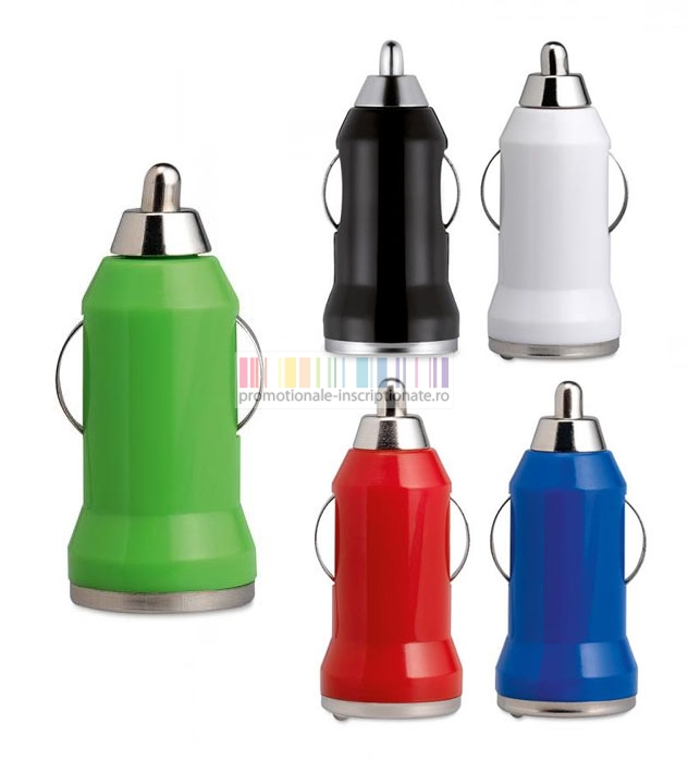 Incarcatoare auto cu iesire USB, realizate din plastic si aliaj de aluminiu - disponibile in 5 culori cu indicator de lumina rosie si prezentat in cutie argintie din carton.