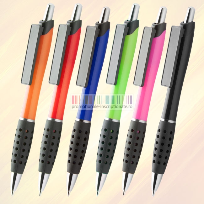 Pixuri promotionale realizate din plastic cu agatatoare lata si grip negru cauciucat, cu accesorii metalice cromate, mecanism de deschidere prin apasare si corp cu forma ergonomica disponibil in sase culori (portocaliu, rosu, albastru, verde, roz si negru).